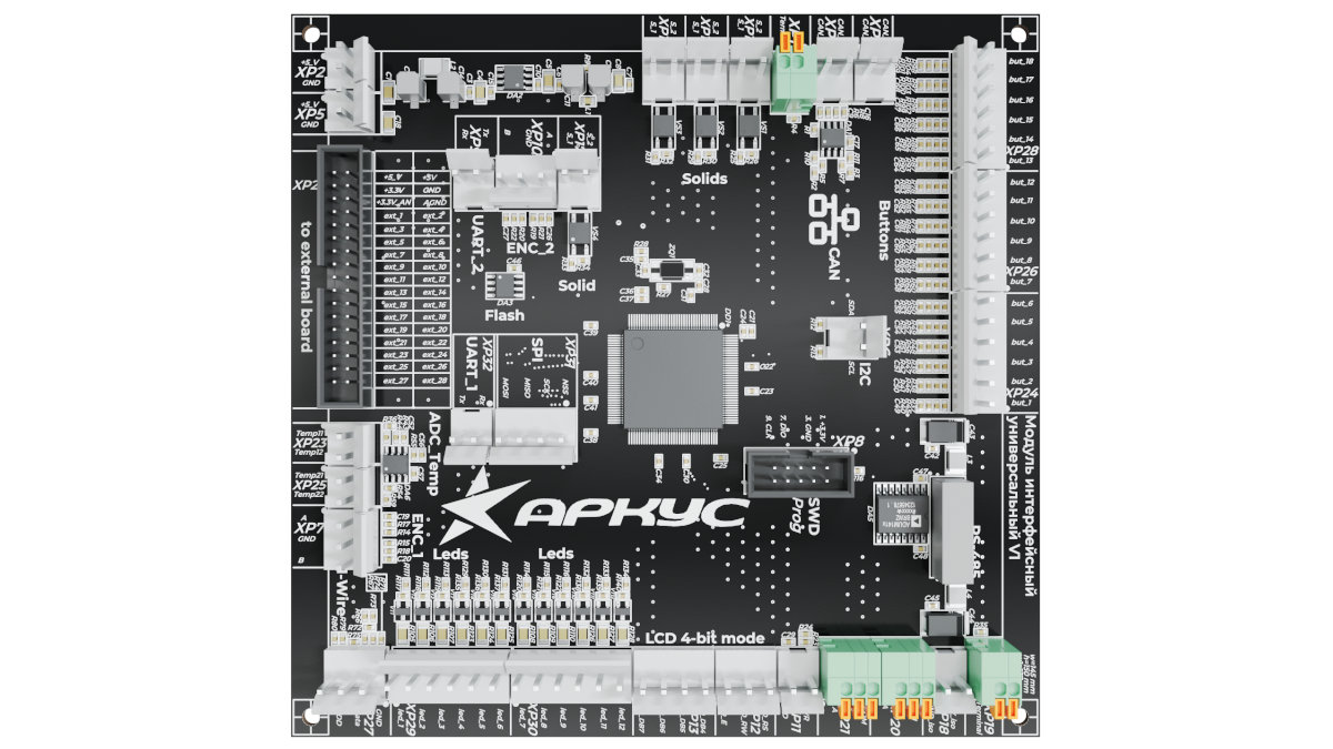 Система управления ARCUS построена на собственной аппаратной платформе, состоящей из платы управления, платы индикации и 10-дюймового сенсорного пульта управления. Платформа имеет возможность масштабирования путем подключения плат расширения, и адаптации интерфейса управления в зависимости от требований заказчика и комплекса подключенного оборудования.